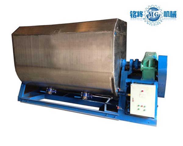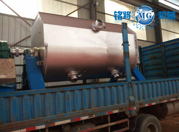 本產(chǎn)品采用U型外觀設(shè)計(jì),內(nèi)部采用雙層螺帶設(shè)計(jì)。即在水平的主軸上裝有兩條或多條輸送能力相同,螺徑不同,螺轉(zhuǎn)方向不同的螺帶。通常是當(dāng)主軸轉(zhuǎn)動時(shí),一條螺帶把物料從左至右輸送,另一條螺帶把物料從右至左輸送。因而在機(jī)內(nèi)發(fā)生對流穿插混合作用,達(dá)到混合均勻的目的。