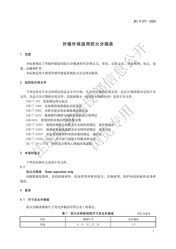 本標準適用于建筑外墻外保溫系統(tǒng)防火分倉用分隔條。