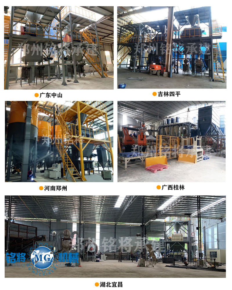 鄭州銘將機(jī)械設(shè)備有限公司研發(fā)生產(chǎn)的全自動(dòng)保溫砂漿生產(chǎn)線,一般情況下會(huì)用到4-6個(gè)原料罐,兩個(gè)大罐用于裝放散裝水泥和粉煤灰,其余小罐用于裝放輕鈣、重鈣、砂、小料等。散裝水泥和粉煤灰進(jìn)罐不需要提升設(shè)備,依靠泵車(chē)打入。輕鈣、重鈣、砂、小料等需要使用斗式提升機(jī)提入小罐,巧妙的物料分配系統(tǒng)支持一個(gè)斗式提升機(jī)分配式作業(yè),從而避免了資源浪費(fèi)。計(jì)量系統(tǒng)在計(jì)量螺旋的配合下,把料倉(cāng)中的原料導(dǎo)入計(jì)量倉(cāng),通過(guò)傳感器的數(shù)據(jù)反饋,實(shí)現(xiàn)原料計(jì)量。計(jì)量好后的物料,通過(guò)螺旋輸送機(jī)導(dǎo)進(jìn)主斗提機(jī),提升到混合機(jī)上部待混料倉(cāng)中。待混倉(cāng)為氣動(dòng)大開(kāi)門(mén)型,可以迅速將待混物料放入無(wú)重力混合機(jī),實(shí)現(xiàn)保溫砂漿連續(xù)生產(chǎn)。